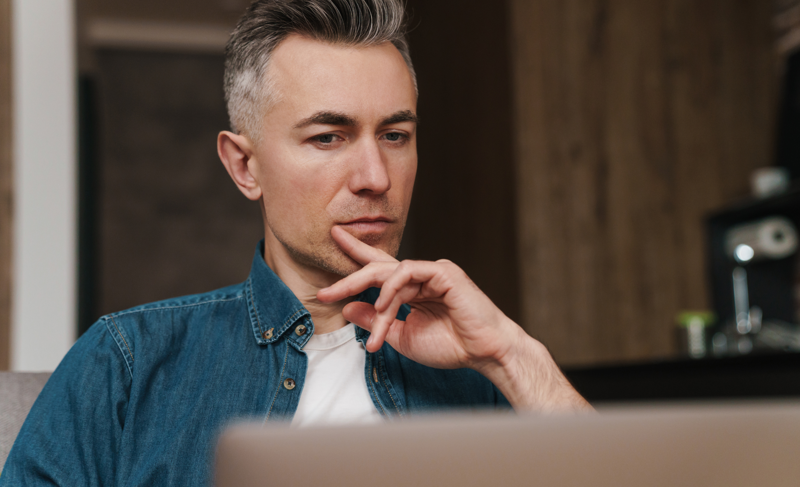 Mann drikker te og leser om hvordan man kan forstå rentefri periode med kredittkort på sin pc